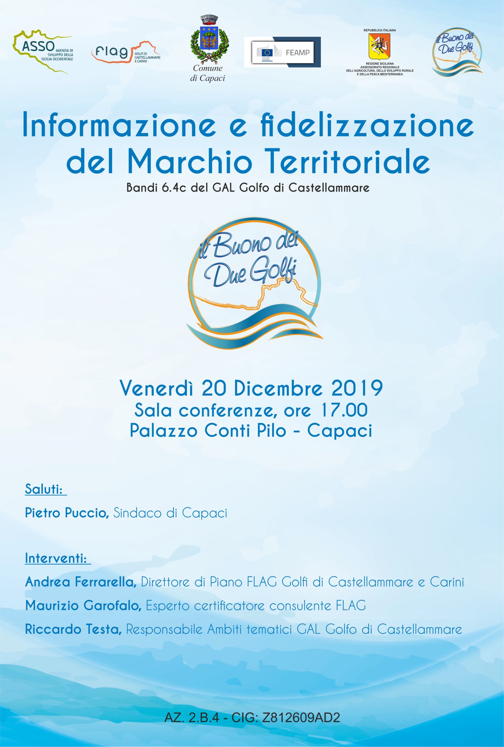 Convegno: Informazione e fidelizzazione del Marchio Territoriale Postato il 12 Dicembre 2019 da FLAG "Golfi di Castellammare e Carini" Venerdì 20 dicembre 2019, ore 17:00 – Sala Conferenze Palazzo Conti Pilo (Capaci) Allegati locandina, 20.12.2019